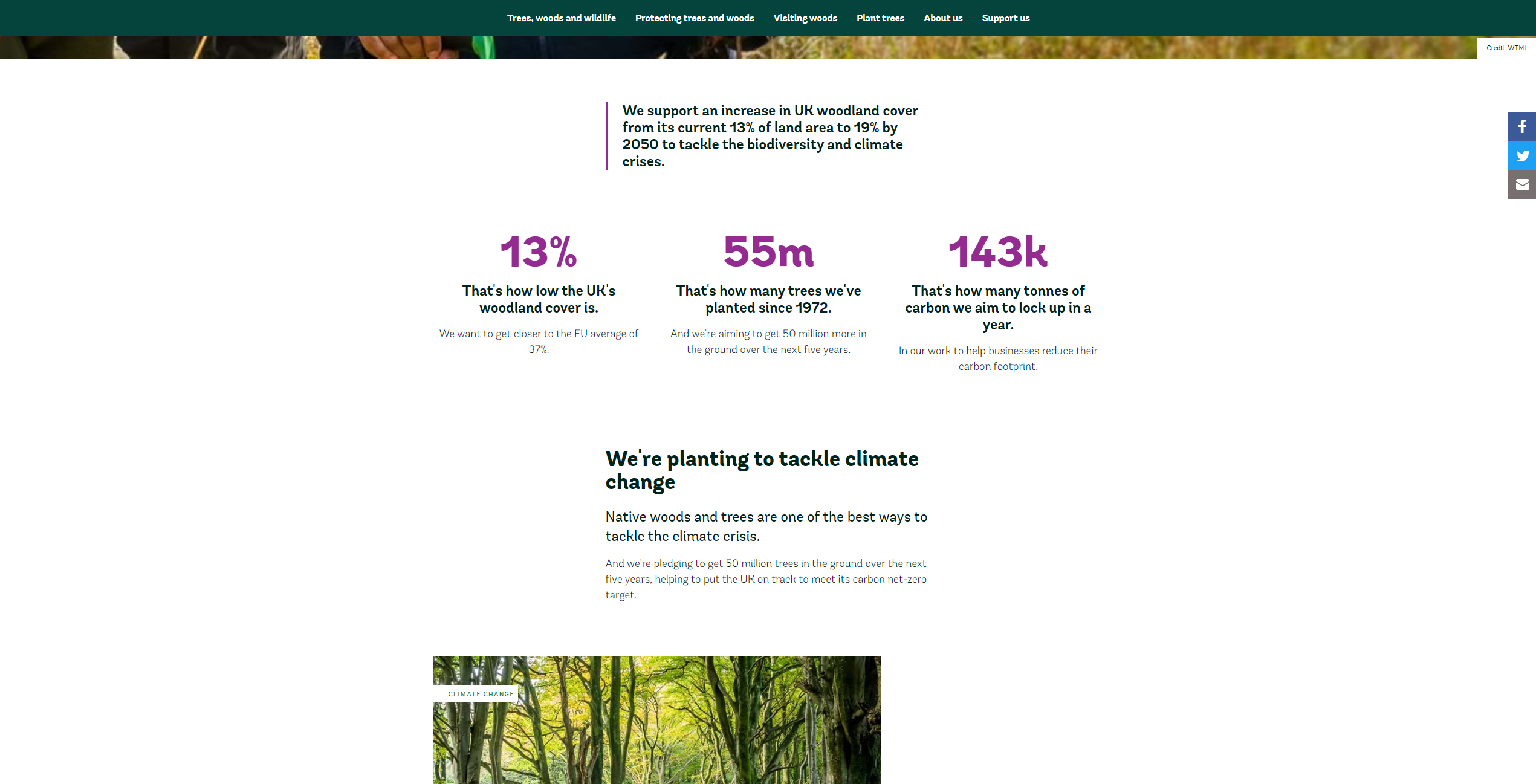 This project relied on myself ensuring that the information and statistics given were completely accurate. The first step in the planning stage was to research all of the necessary information and build my own documentation for reference. With the project being inspired by The Woodland Trust, I used their page to find the relevant information – such as only 13% of the UK being covered by the Woodland as of 2022 – and then retrieved other information from an article on Gardeners' World, verifying their information with other sources.